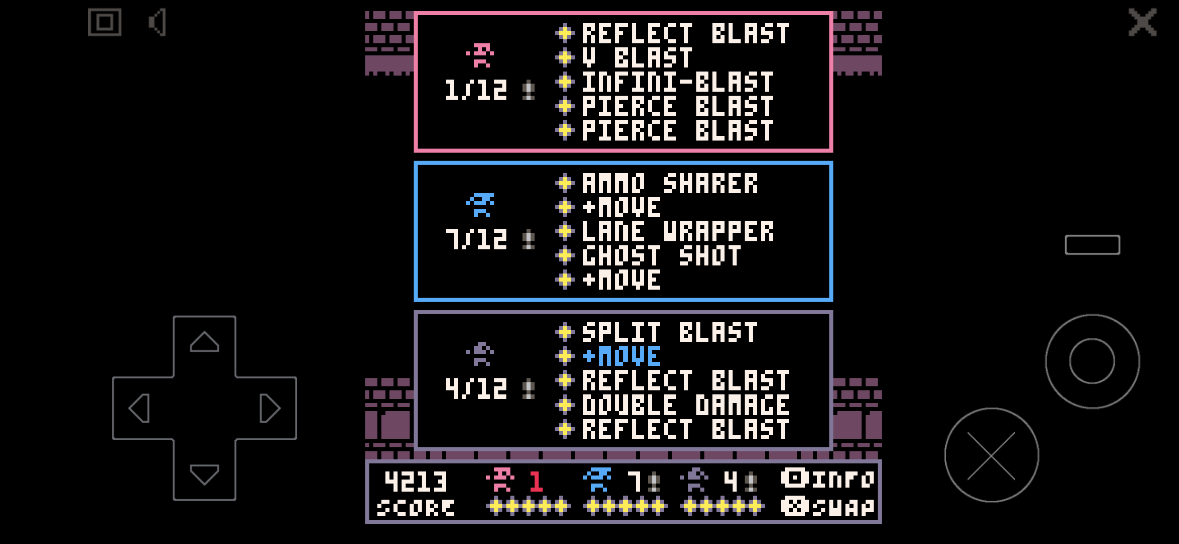 This is some great feedback! I definitely wanted to add more abilities but I hit the limitations for the amount of code that fits on a Pico8 cart (and my ability to optimise it😅). So I might need to consider porting the game to a different engine if I want to take this idea much further. Unlocking the different playmodes might be possible though?
